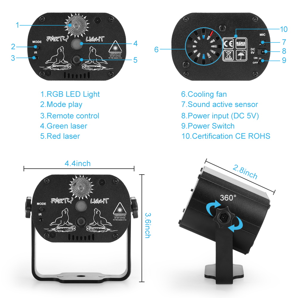 * IR remote,Compared with other portable stage lights, our cordless laser lights are designed with voice-activated mode or intelligent mode, you can easily switch between the two modes by pressing the button.